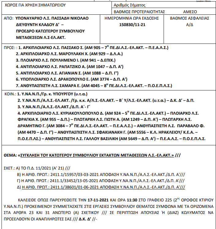 Την Τετάρτη 17-11-2021 και ώρα 11:30 ξεκινά τις εργασίες του το Κατώτερο Συμβούλιο Έκτακτων Μεταθέσεων Λ.Σ.-ΕΛ.ΑΚΤ. σύμφωνα με τα οριζόμενα στα άρθρα 23 και 31 του Π.Δ. 11/2021 (Α΄21), που συγκεκριμένα αφορούν στις έκτακτες μεταθέσεις για τη στελέχωση θέσεων ευθύνης και στις έκτακτες μεταθέσεις των στελεχών Λ.Σ.-ΕΛ.ΑΚΤ., που υπηρετούν σε θέσεις εξωτερικού αντίστοιχα.