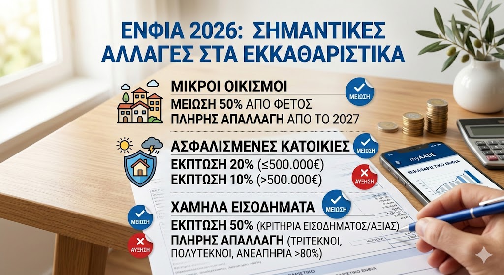 Ωστόσο, τουλάχιστον 2 στους 7 ιδιοκτήτες θα διαπιστώσουν μειώσεις στον τελικό φόρο, χάρη σε νέες εκπτώσεις, απαλλαγές και αλλαγές στον τρόπο υπολογισμού.