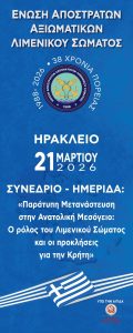 Η Ένωση Αποστράτων Αξιωματικών Λιμενικού Σώματος – Ελληνικής Ακτοφυλακής διοργανώνει Συνέδριο – Ημερίδα το Σάββατο 21 Μαρτίου 2026 και ώρα 10:00 στο Ηράκλειο Κρήτης (Αίθουσα ΄΄Μανόλης Καρέλλης΄΄-Ανδρόγεω) με θέμα: «Παράτυπη Μετανάστευση στην Ανατολική Μεσόγειο: Ο ρόλος του Λιμενικού Σώματος και οι προκλήσεις για την Κρήτη».
