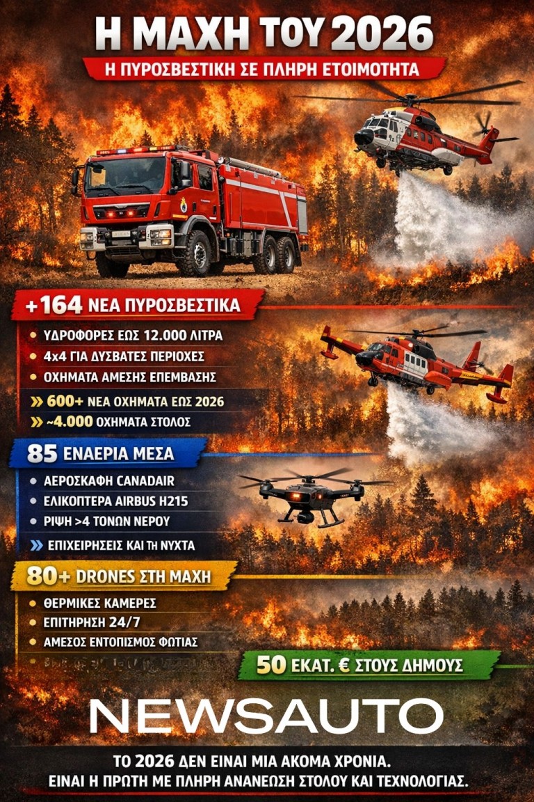 Για το 2026, η Ελλάδα συνεχίζει να επιχειρεί με 85 εναέρια μέσα — αεροσκάφη και ελικόπτερα. Έχουν δρομολογηθεί νέα ελικόπτερα τύπου Airbus H215, που μπορούν να ρίχνουν πάνω από 4 τόνους νερού ανά ρίψη, ενώ προηγμένα συστήματα πλοήγησης επιτρέπουν πλέον νυχτερινές επιχειρήσεις. Παράλληλα, σε κρίσιμες υποδομές όπως τα αεροδρόμια, εντάσσονται υπερσύγχρονα οχήματα τύπου PANTHER 6×6, ειδικά σχεδιασμένα για άμεση επέμβαση.